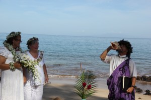 I have just added a separate post including pictures and a transcript of our ceremony. It was a fantastic Hawaiian beach wedding. As you can see in this picture of Lisa and me – we are soooo happy! It was the perfect day, we had 12 guests, beautiful morning at the beach, wonderful spot and we had brunch at the Grand Wailea. The hula band even played a special song so the two of us could have our wedding dance! The Hawaiian ceremony was full of symbolism and meaning. I have always dreamed of being the bride at a wedding (well, one of the brides …). So this was very special for me.